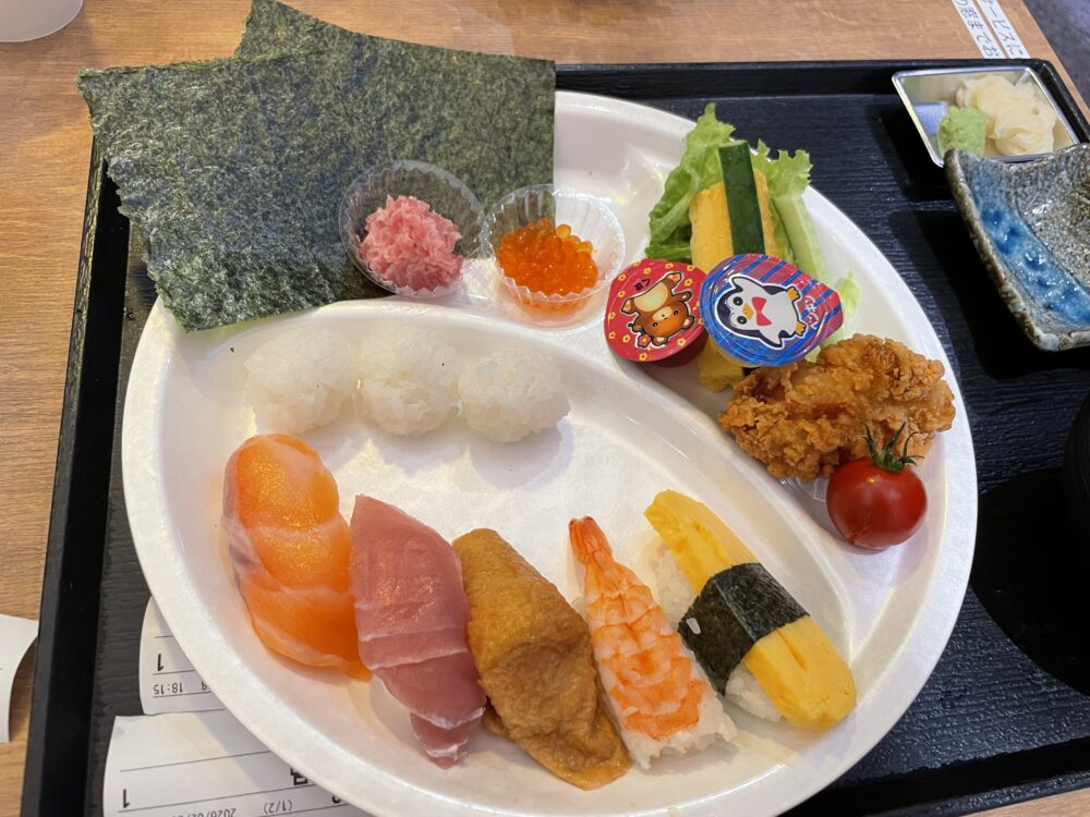 お寿司5貫に、イクラ、トロの手巻き寿司も作れる、子供に嬉しいセットです。