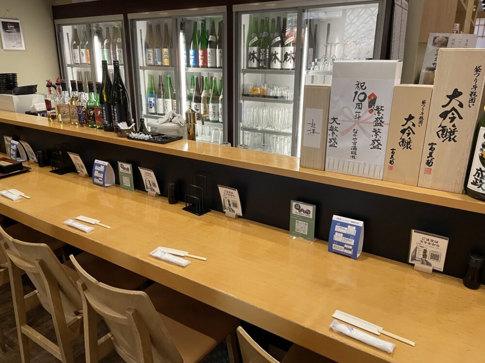 カウンター後ろの冷蔵ケースには、富山の地酒がずらりと並んでいます。