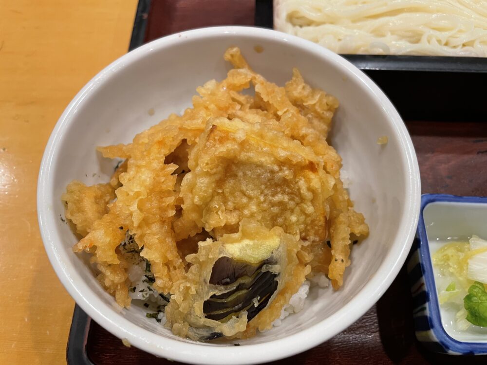 白えび天丼は、タレがしっかり絡んだ「しっとり系」の天丼です。具材は、白えび、ナス、かぼちゃ。