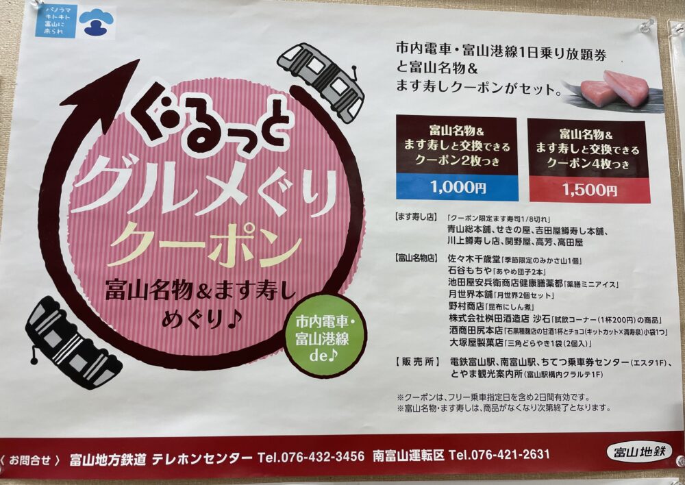 路面電車の1日乗り放題券と、指定のお店で富山名物やます寿司と交換できるクーポンがセットになった「ぐるっとグルメぐりクーポン」も販売されています。
